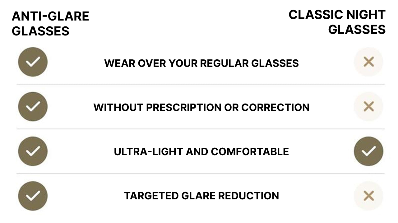 Thanks to their wraparound design, the Anti-Glare Glasses can be worn directly over your prescription glasses, without slipping or squeezing.